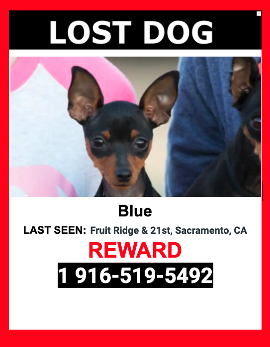 Pet Description:Blue is a Female,Black with Brown Ears and Chest, Miniature Pinscher who escaped and was last seen near Fruit Ridge & 21st. Blue is not wearing a collar and it is unknown if Blue is microchipped. If you see Blue please DO NOT CHASE HER. PLEASE CALL OR TEXT ONLY. 1 916-519-5492 $$ Reward $$ |