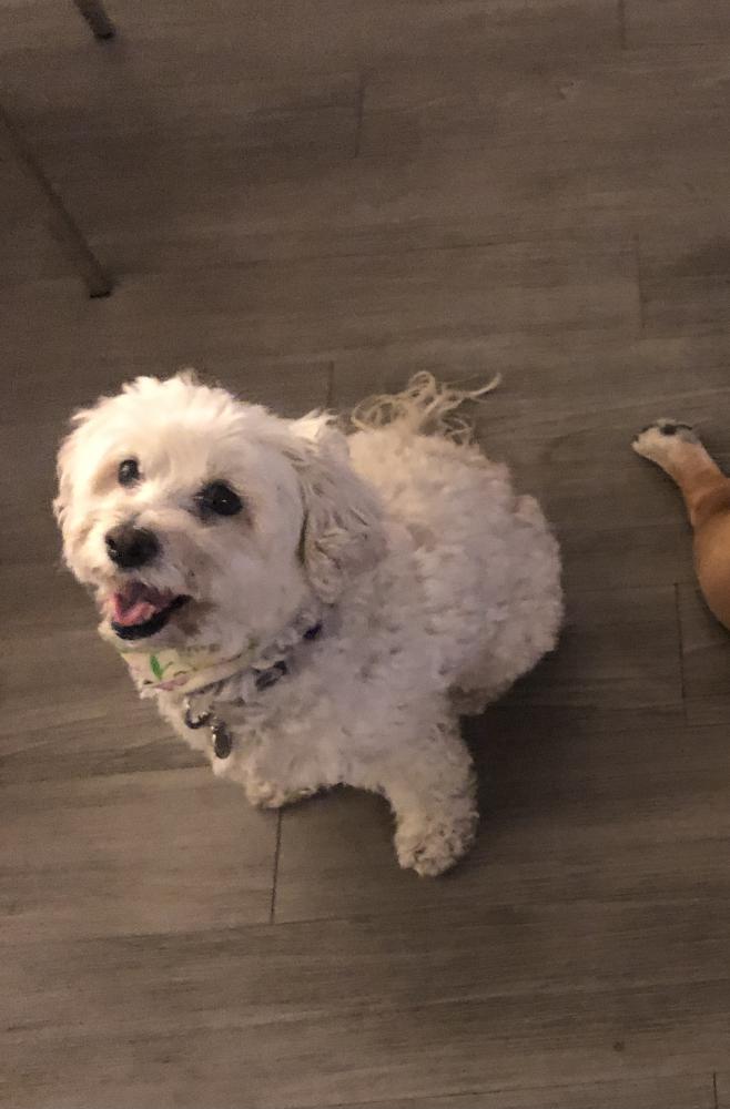 Pet Description:Small white dog around 20 lbs who was not wearing a collar. She is all white and has black eyes. |