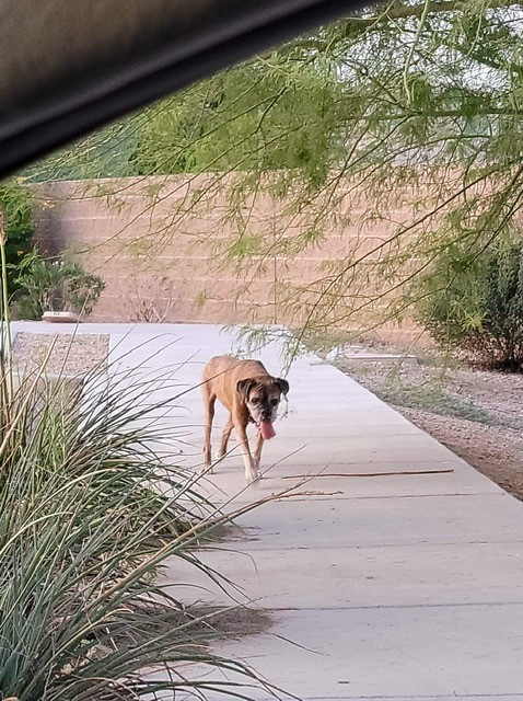 Pet Description:Brindle Boxer.. She is 13 years old with white paws and has a lot of grey on her face. |
