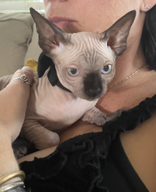 Pet Description:Blue eyed hairless kitten, tan skin. 5 months old. last seen with a black bowtie. very small. If you've seen or heard anything please reach out. $1,000 Reward |