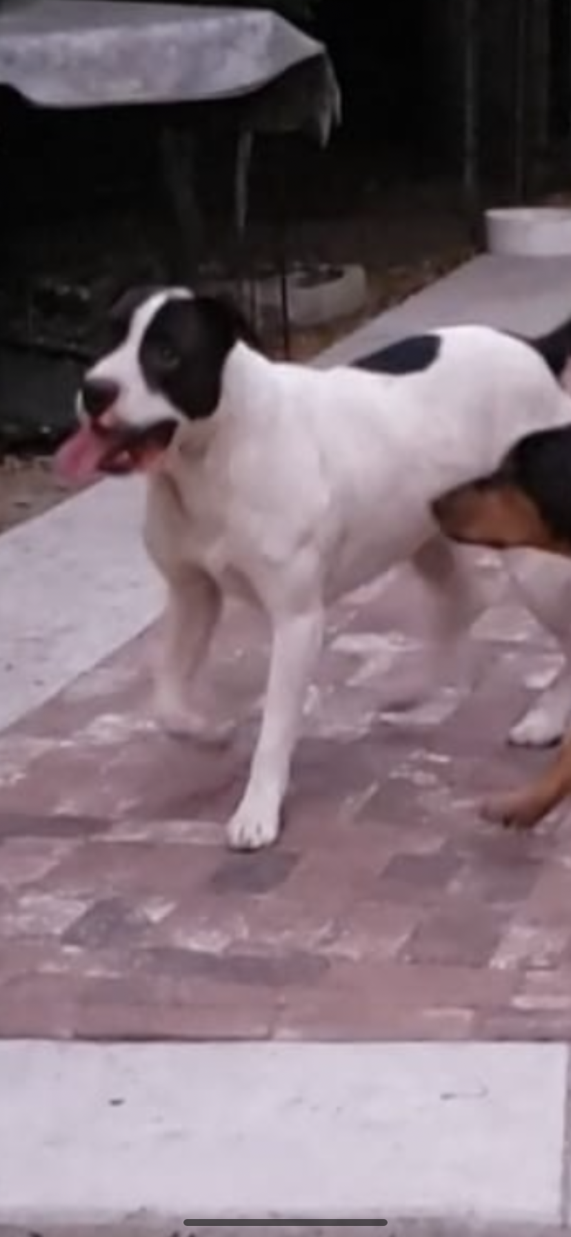 Pet Description:Friendly medium size male pitbull. Mostly white with some large black spots. Black spots over eyes. |