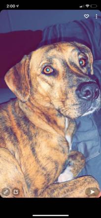 Pet Description:tan/orange/brown brindle , maybe 30 lbs , shes neutered , and she is not chipped . |