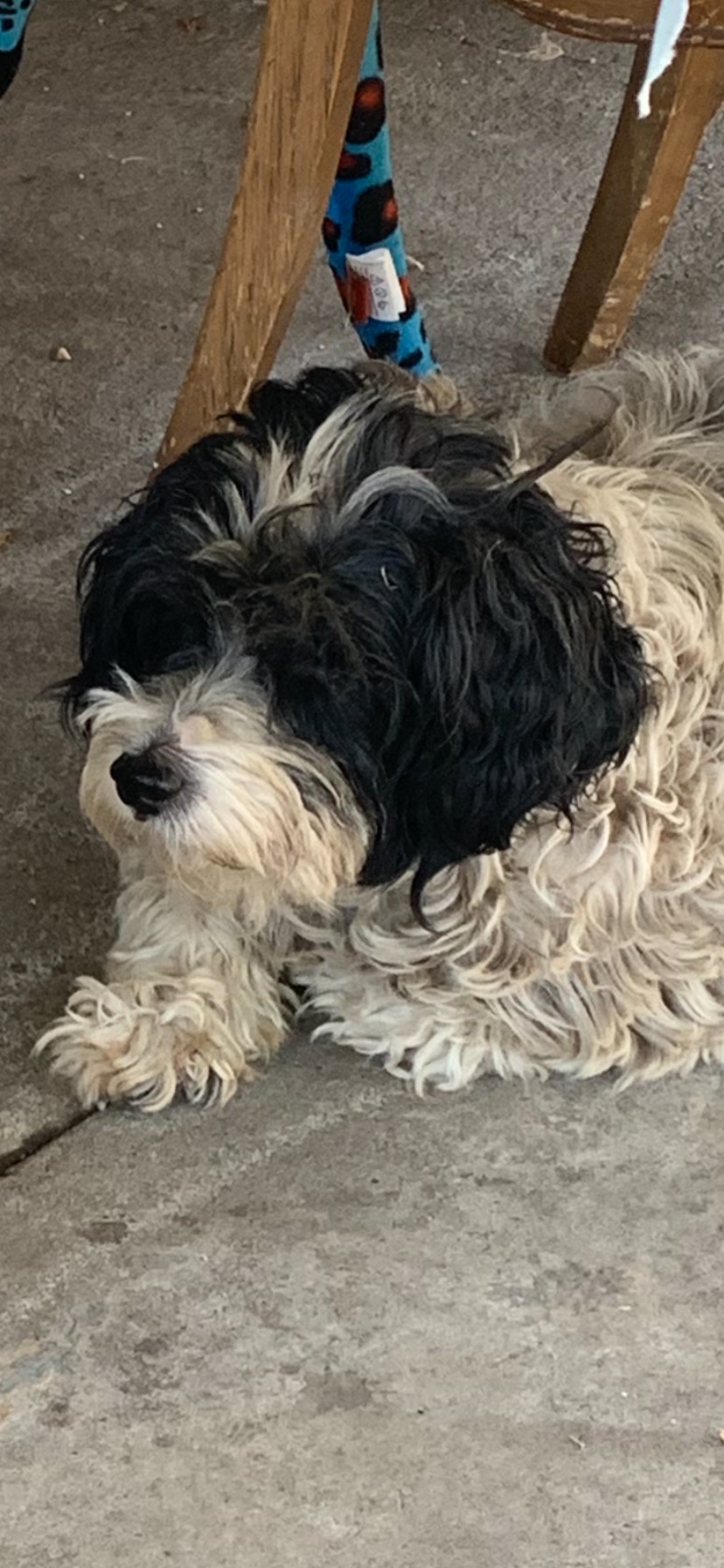 Pet Description:Male poodle mix black and white - medium size last seen wearing green jacket vest is blind in one eye |