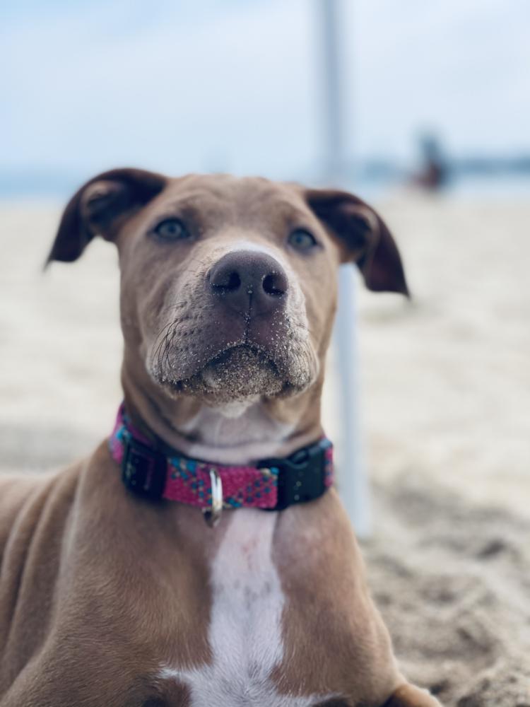 Pet Description:Pitt/Rhodesian ridgeback female9 mo old tan/white neck pink aztec collar |