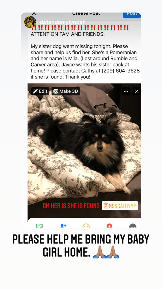 Pet Description:Black and white Pomeranian. Goes by Mila. Very friendly and calm. Please help us bring her back home to our 18 month old son. ???? |