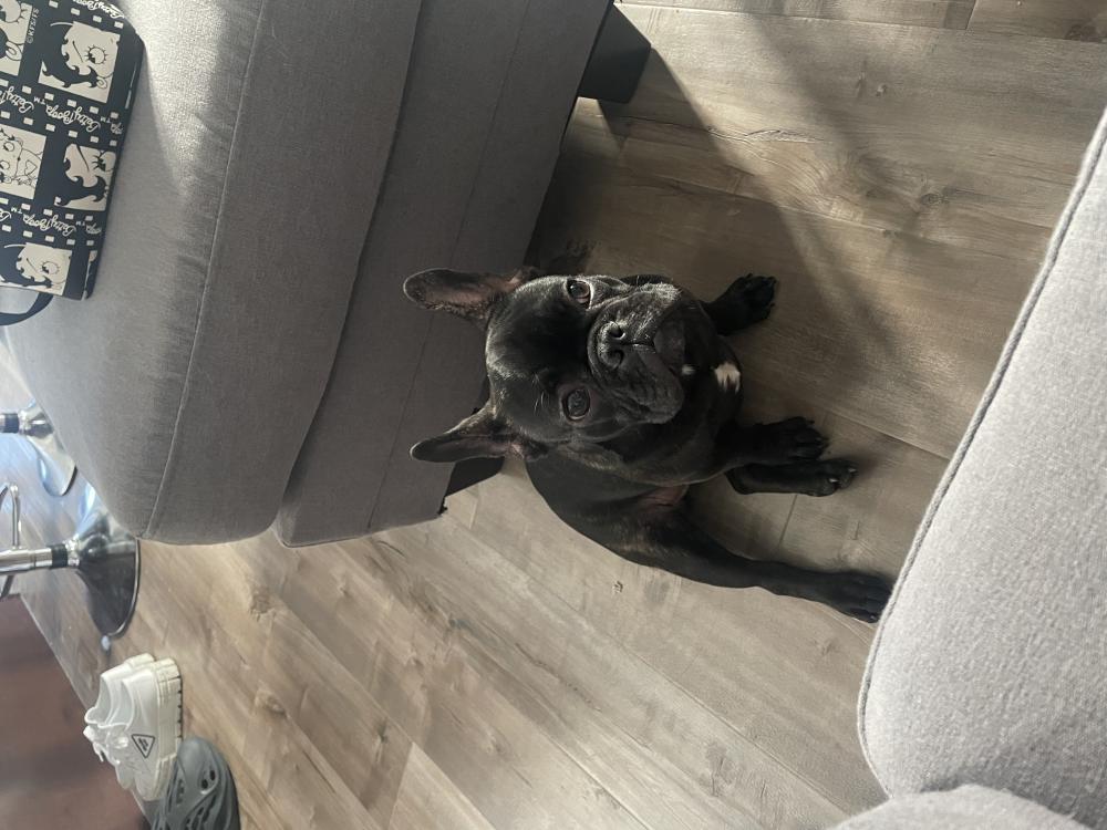 Pet Description:6 month old french bulldog male. no collar. black and brown brindle. white stripe on chest |