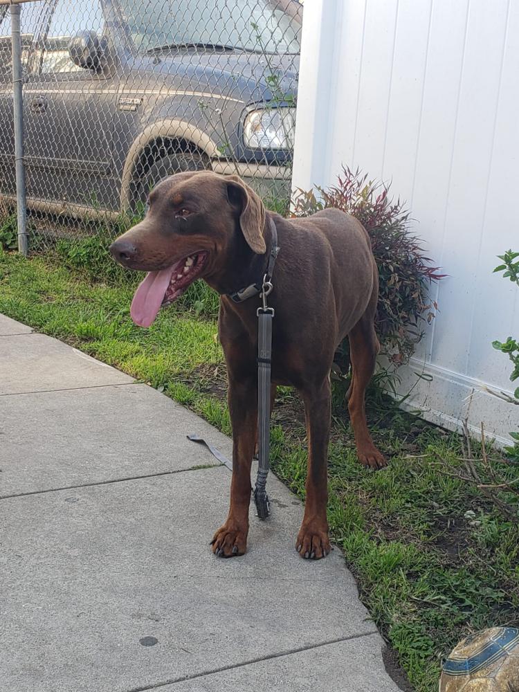 Pet Description:Big, brown, seemed old, mixed breed or Doberman type mix. Has worn-out skin on elbows. |