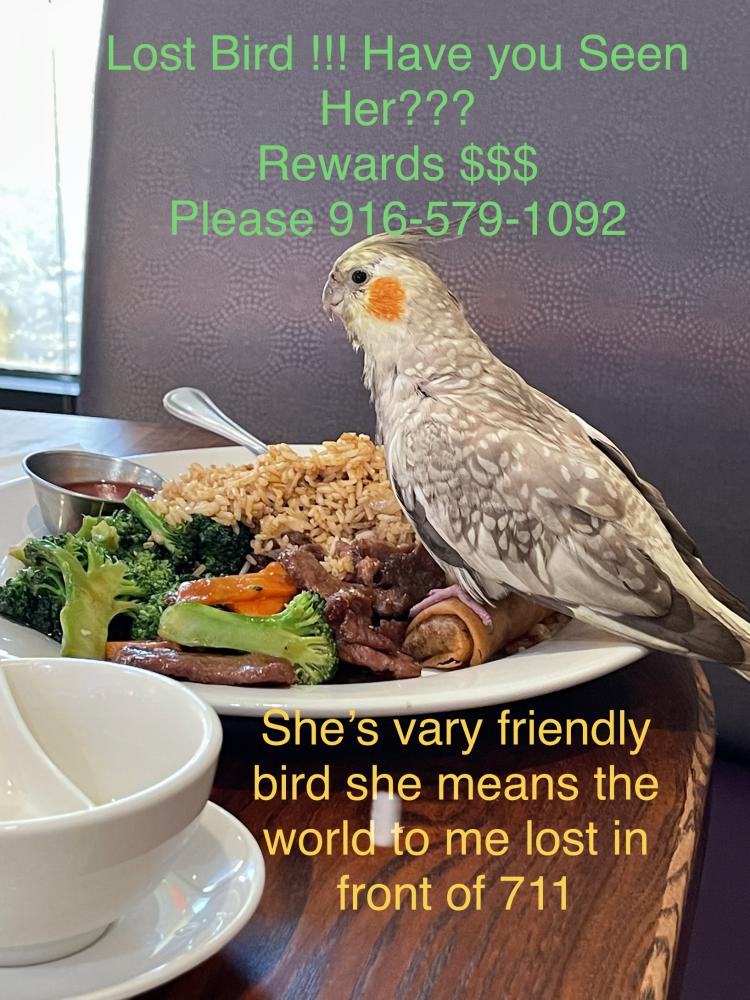 Pet Description:My poor baby was lost or found at 7/11 in Marconi and hwy80. Unfortunately I had a long drive so I pulled over at the 7/11 and took a nap with my baby in the car and my significant other . But when I woke up she was gone . She would never travel far she would always fly back to me I believe someone found her on the grass or someone saw her hanging out on the roof or window of my car . She means the world to me I can’t sleep with out her I passed out flyers probably do it again this week . Pleas |