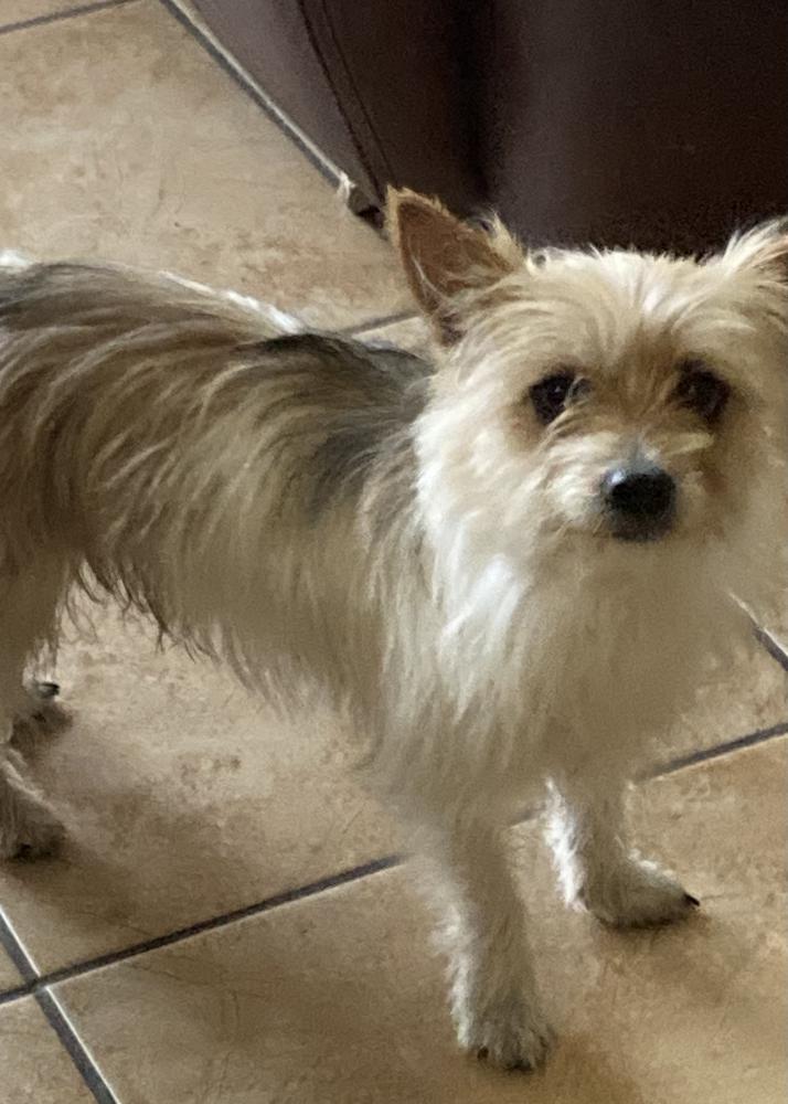 Pet Description:He followed my neighbors kids home from school. He's sweet and calm. He's white, and beige with some black. |