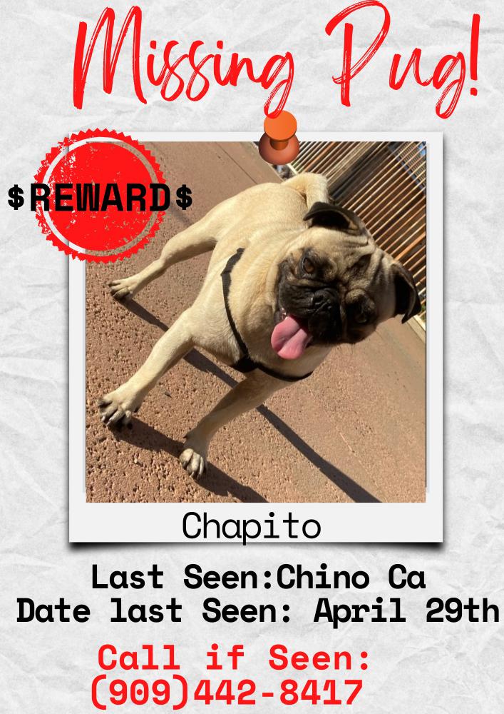 Pet Description:Been looking for my pug since April 29th please help me ??Help me find my pug! Last seen from eastend and chino ave crossstreetsHes a 3 year old dog, male, brown , brownish colored eye, had no collar he would take it off, hes a friendly dog |