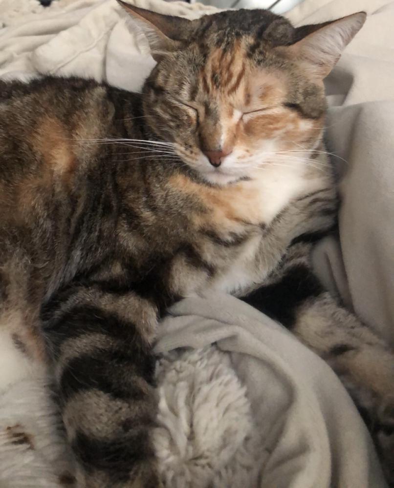 Pet Description:6-8 year old calico-ish female cat with light green eyes, short haired black tail with grey stripes, not a small cat, is friendly but skittish around new people may run away |