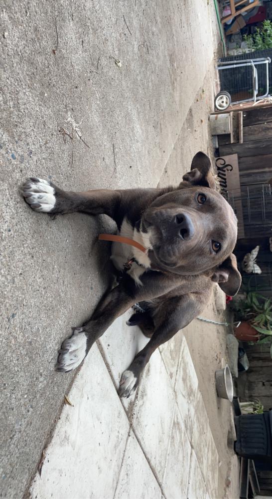 Pet Description:Mixed colored fur black brown and white spot on chest and white paws, has light purple collar on, medium/ large breed |