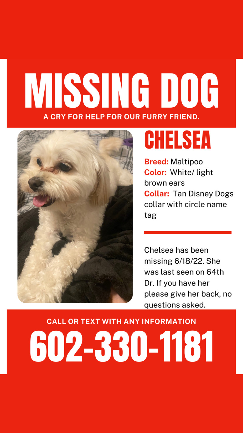 Pet Description:She’s a 7 year old maltipoo mix with light brown ears. She’s super friendly. Responds to Chelsea. Please bring my baby home. |