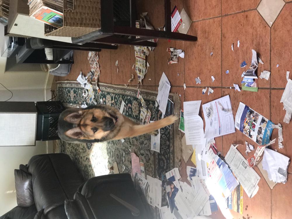 Pet Description:Pink collar, very fluffy/furry. Friendly maybe shy, 100lbs or so only a year old. Has a circular color light on collar. |