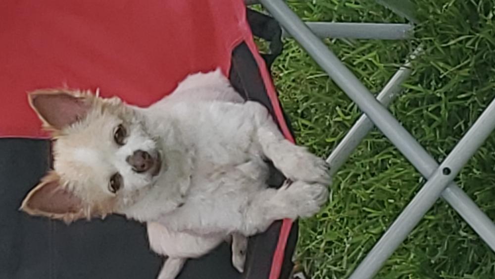 Pet Description:17 years old. Minie h?r nameWhite and gold fur. Partial d?f and blind |