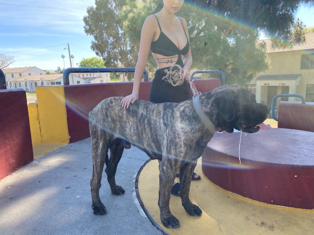 Pet Description:Midnitelove is a large 150 to 200 pound English mastiff he is Brenda his base coat is black and his stripes are beige he’s my service dog so I really need him back if you’ve seen him please return him. |