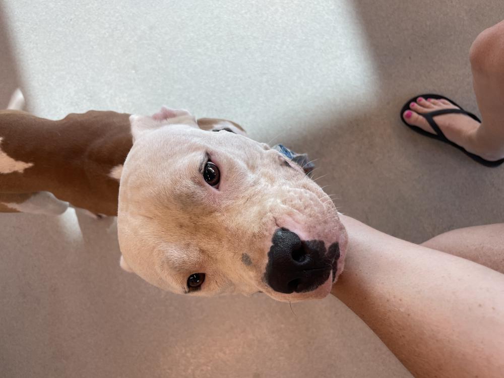 Pet Description:50 lbs, white head, tan body. Very sweet young male. Black nose. Knows simple commands and does well on the leash. |
