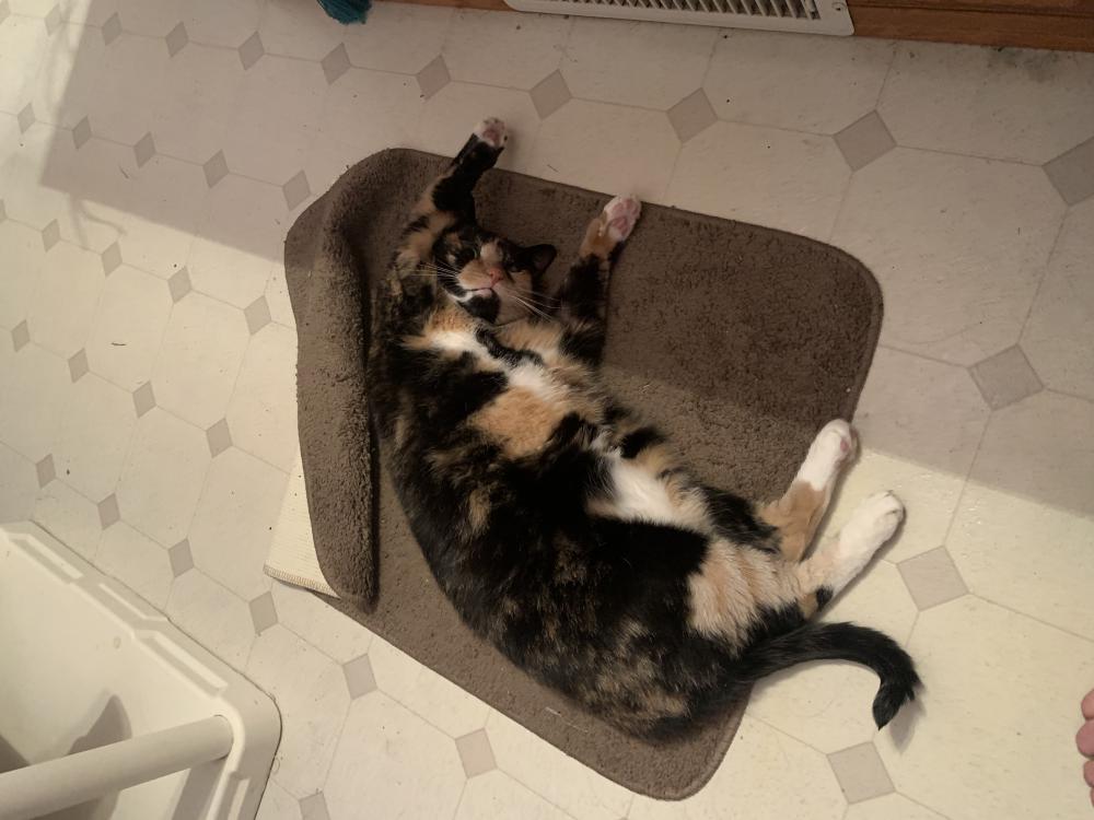Pet Description:Female calico cat with four white paws and a foggy left eye |