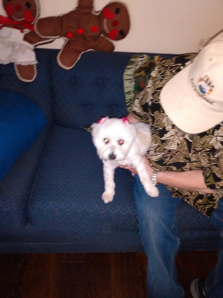 Pet Description:White maltipoo wear a pink and green color with unicorns. About 7 lbs Name is Marian. |