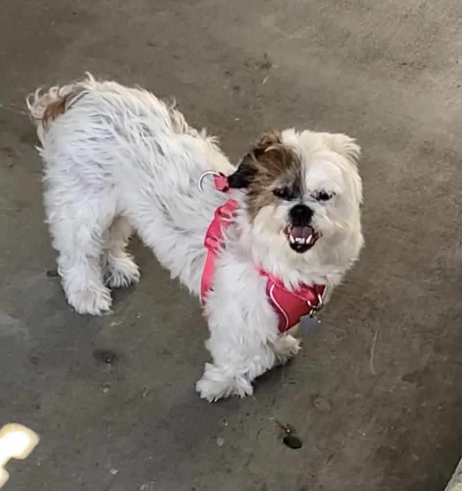 Pet Description:Pink Harness, Mostly white fur, Brown patch of fur on right side of face, Girl |
