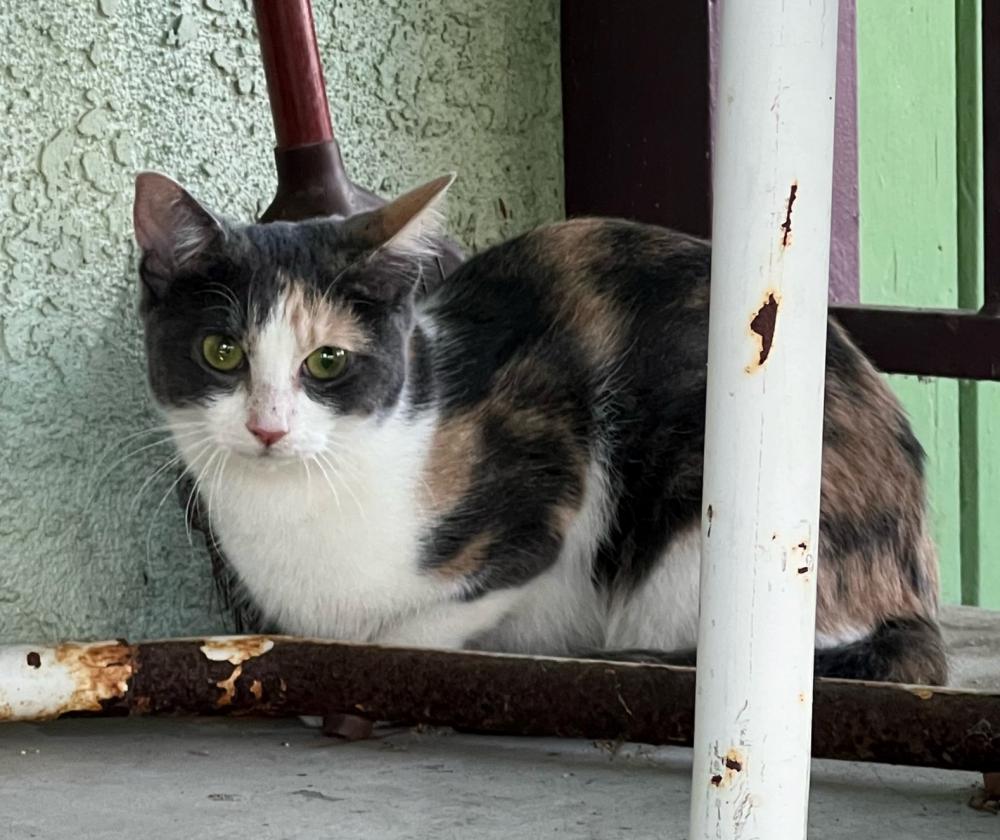 Pet Description:Very sweet, young, smaller cat. She is tan, white, and grey. She is clearly domesticated, uses litterbox and is happy to be inside and be pet. |