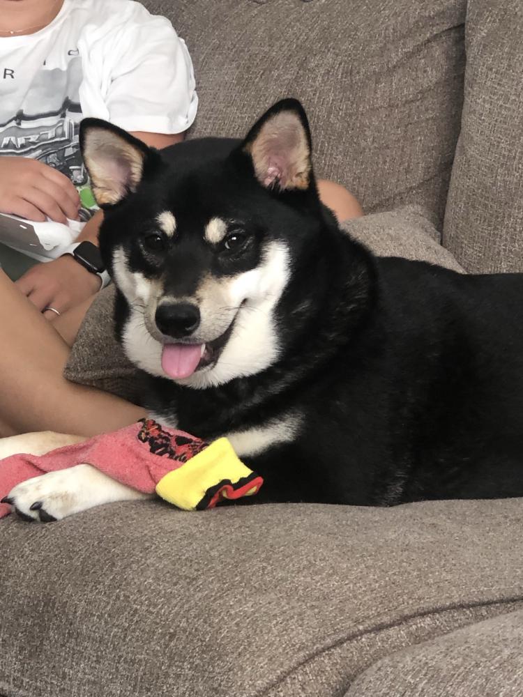 Pet Description:30lb black shiba inu with white underbelly and face, has a collar on it with a paw pattern |