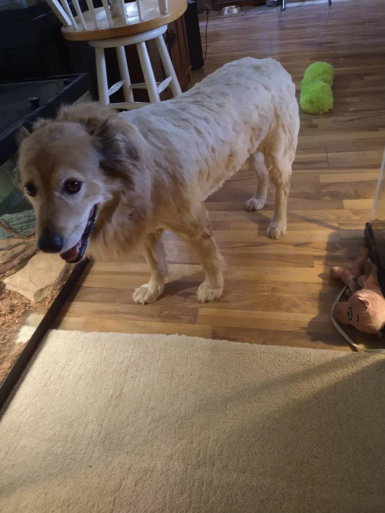 Pet Description:Collie and retriever mix, about 60lbs, orange collar, hair cut like a lion. |
