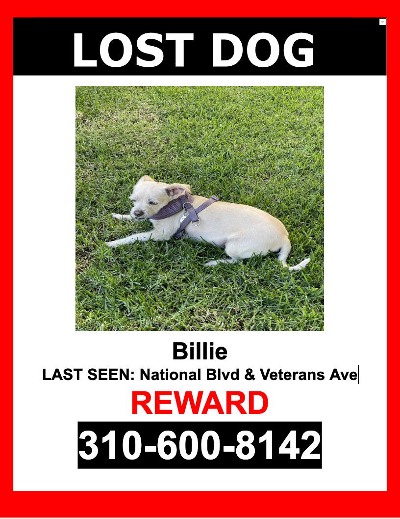 Pet Description:MISSING SINCE 10/18/2022 AT 5:30 PM**Billie is a Female, Tan color, Mixed Breed who escaped and was last seen near National Blvd & Veterans Ave.Billie is microchipped.If you see Billie please DO NOT CHASE HER.PLEASE CALL OR TEXT ONLY.310-600-8142$$ Reward $$ |