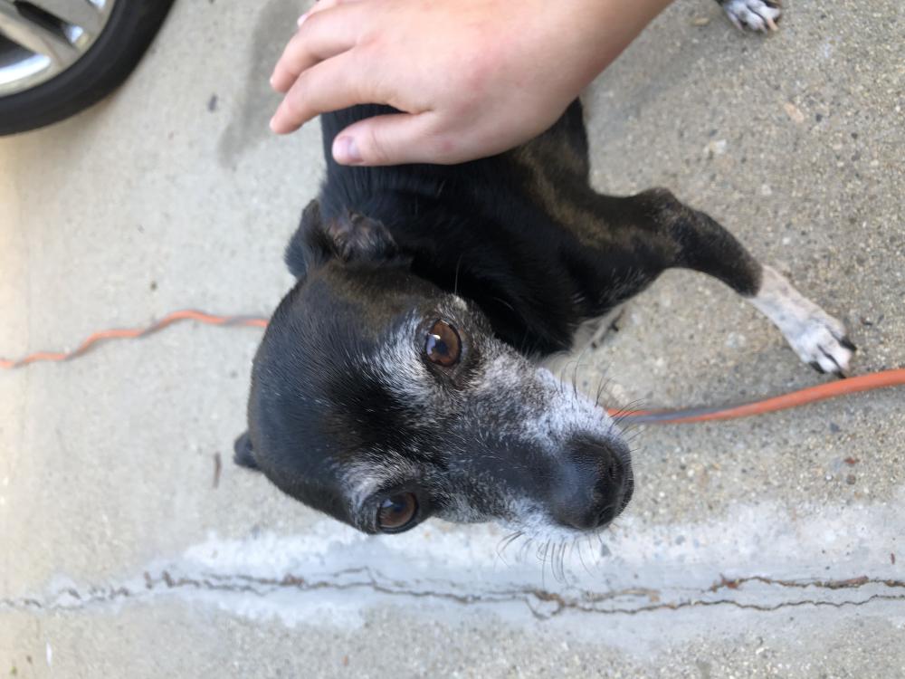 Pet Description:Small, older, male black dog with white paws. No collar and no chip. |