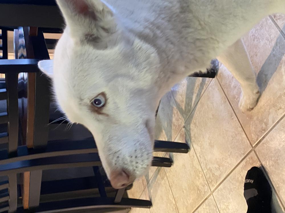 Pet Description:Young, white female husky with black collar. Recently spayed and very well behaved. |