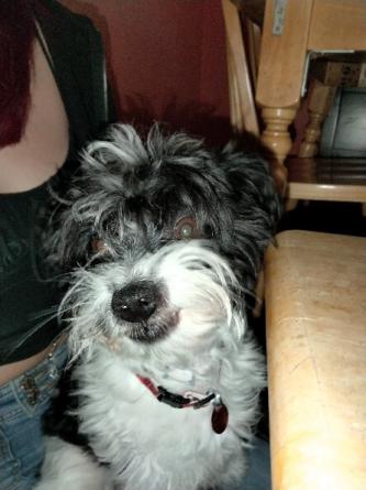 Pet Description:Black and White, fluffy was wearing a black and Orange shirt that says my mommy is my boo. |