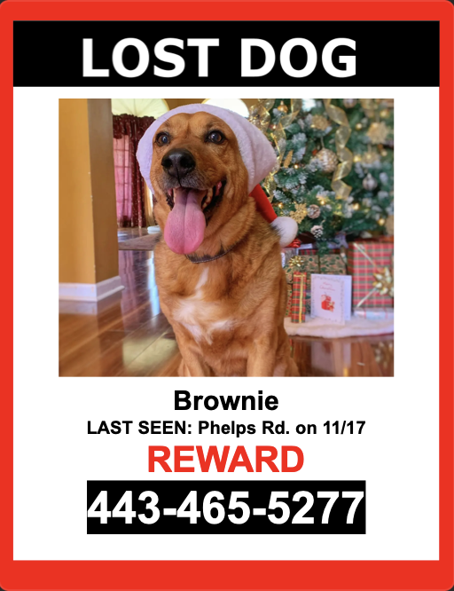 Pet Description:**MISSING SINCE 11/17/2022 AT 7:00 PM**Brownie is a male, reddish/brown with a little black around his eyes and mouth, Beagle/Shepard mix who escaped and was last seen near Phelps Rd..Brownie is does have a skin tag on his hind legIf you see Brownie please DO NOT CHASE HIM/HER.PLEASE CALL OR TEXT ONLY.443-465-5277$$ Reward $$ |