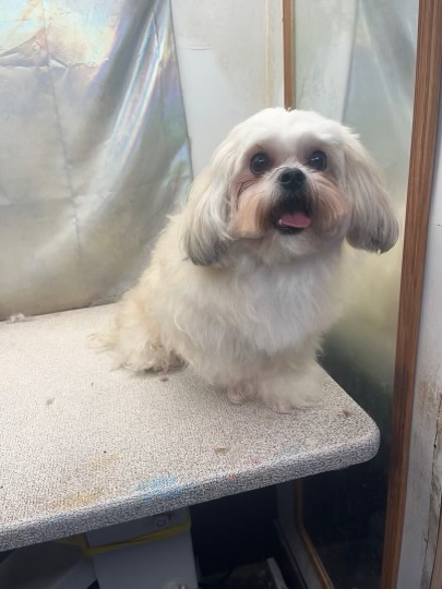 Pet Description:small bichon/ shih tzu, red collar, tan on face in bear & stache and on his back |