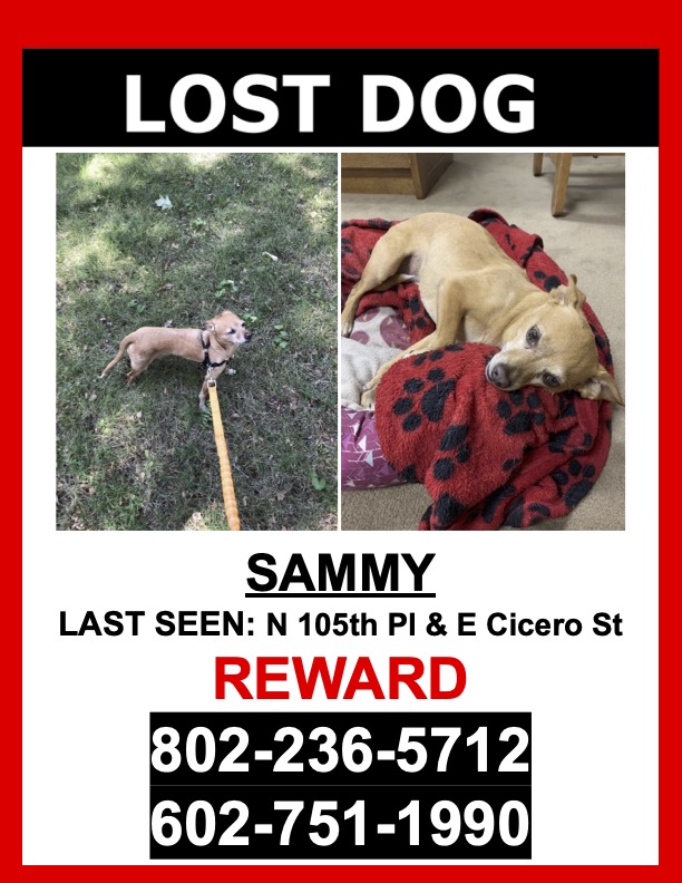Pet Description:LOST _//DOG//_ - TAN / WHITE STRIPE ON BACK / CHIHUAHUA / MALE - $$ Reward $$ **MISSING SINCE 11/28/2022** SAMMY is a TAN / WHITE STRIPE ON BACK / CHIHUAHUA / MALE who escaped and was last seen near N 105th Pl & E Cicero St. SAMMY is NOT wearing HIS COLLAR and IS microchipped. If you see SAMMY please DO NOT CHASE HIM. PLEASE CALL OR TEXT ONLY. 802-236-5712602-751-1990$$ Reward $$ |