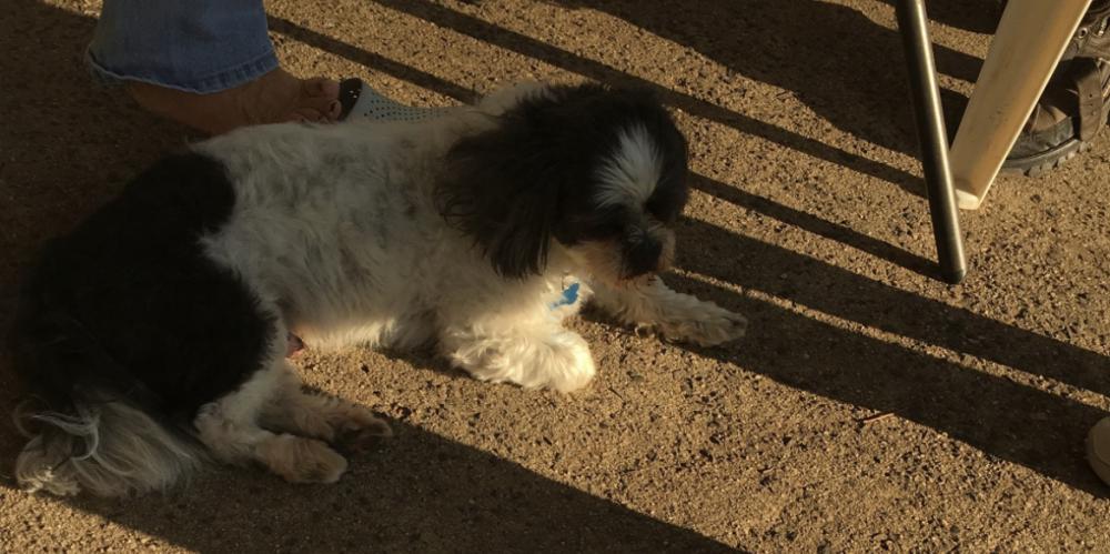 Pet Description:Small/medium dog, shih tzu mix, black and white, shy but friendly, one blue and brown eye, last seen wearing a green sweater |