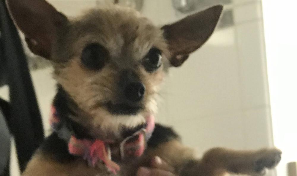 Pet Description:Long haired black tan white female chihuahua wearing pink multicolored collar |