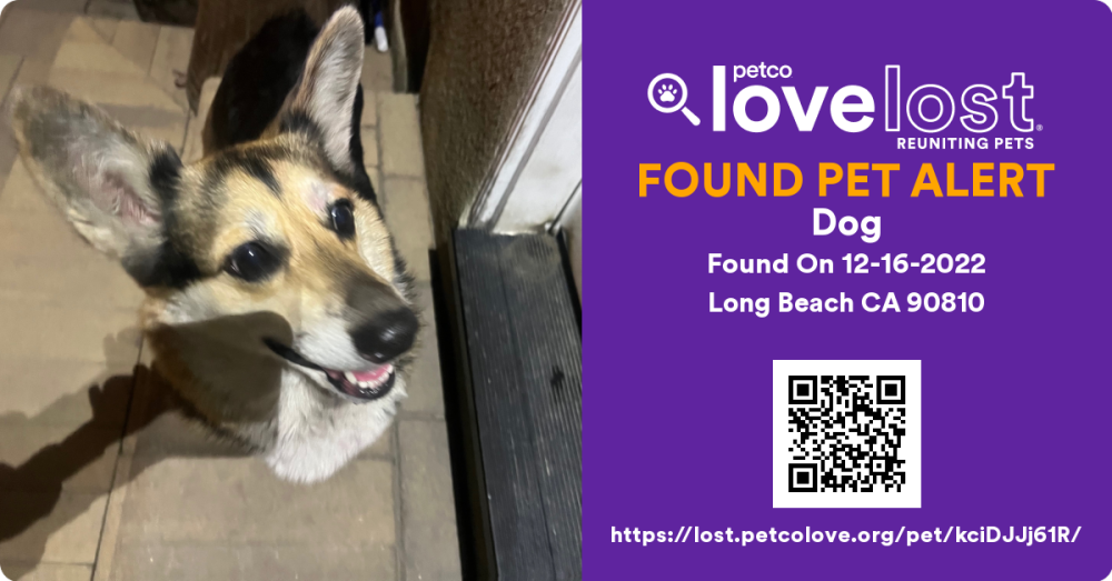 Pet Description:Small, Medium-haired Pembroke Corgi without a collar. Not microchipped. Friendly and energetic. Good with walking on leash and car rides. |