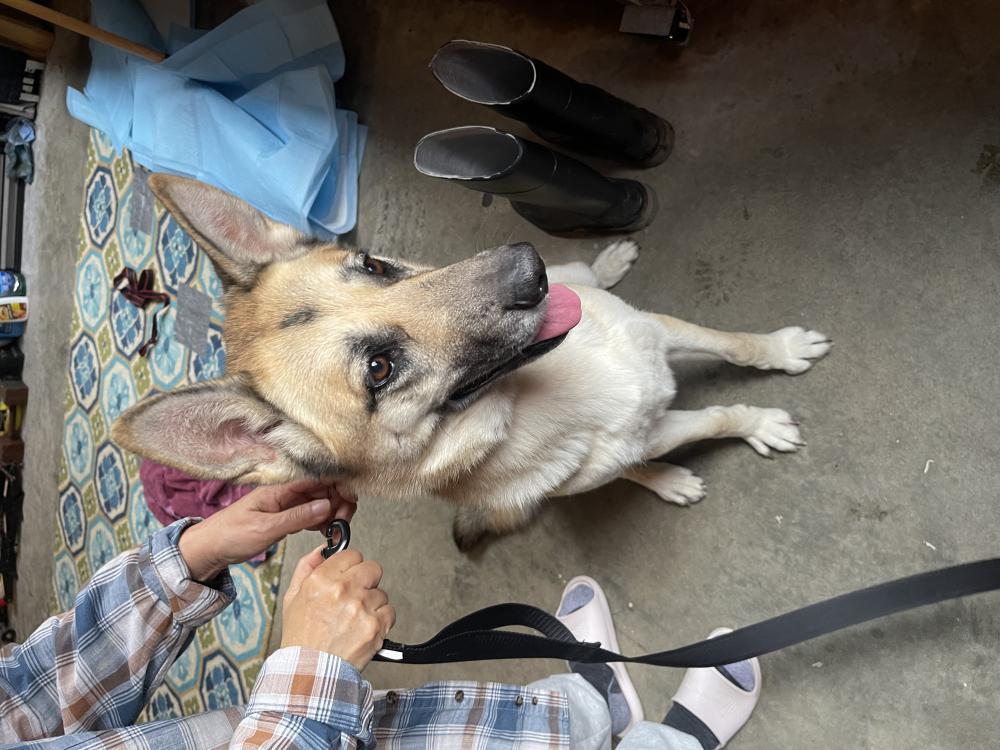Pet Description:Tan and Black Female, tied with a broken leash |