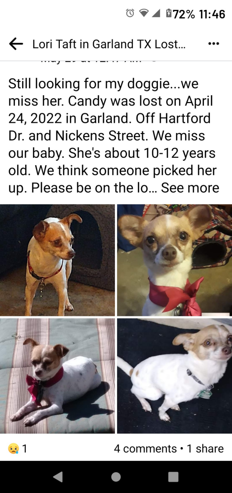 Pet Description:Candy is a female Chihuahua that is white with tan spots. Very thin and dainty. |