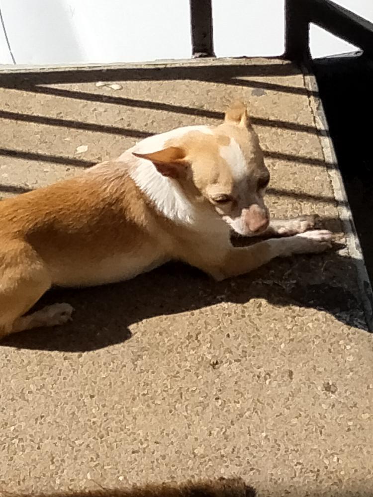 Pet Description:Golden Chihuahua with white going down the middle of his face, aswell as his tummy being white |