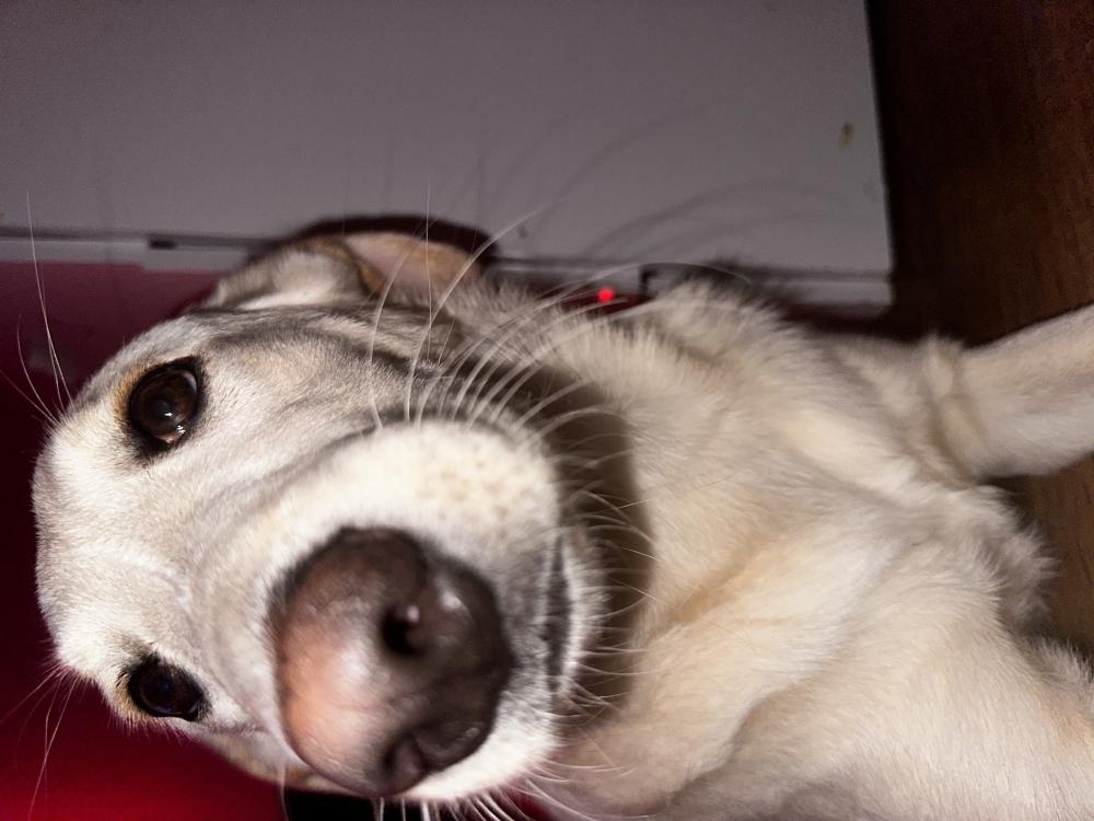 Pet Description:She is about to be one she’s a yellow-white Labrador medium sized, her nose is black with pink splotch on her nose and her fur i between her eyes makes it look like a line |