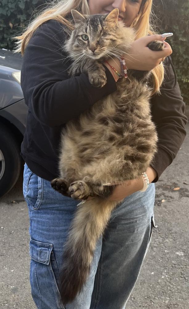 Pet Description:Gray with black and white, he lacks his left eye, he is fat and big |