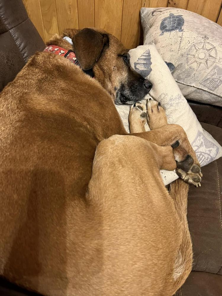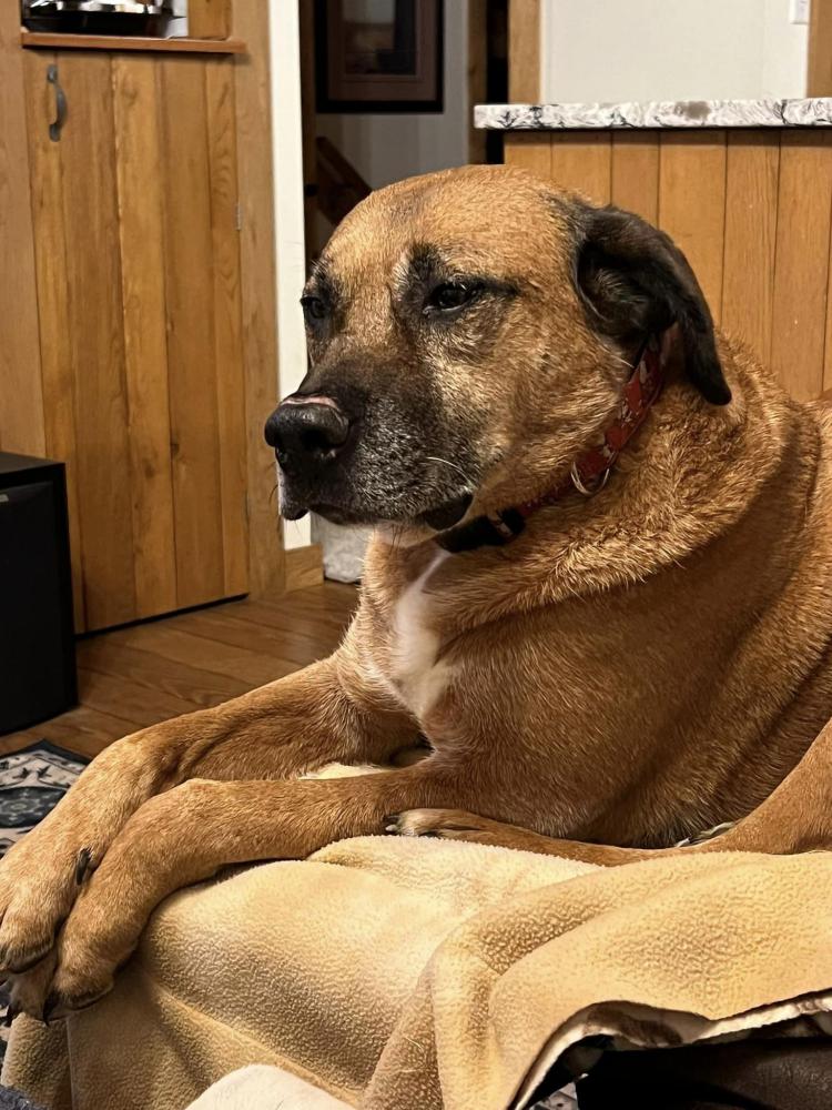 Pet Description:He’s 9 years old & ~ 70-75 lbs. Redish/Brown coat with a white chest & grey on his snout & red collar with Snoopy on it. |