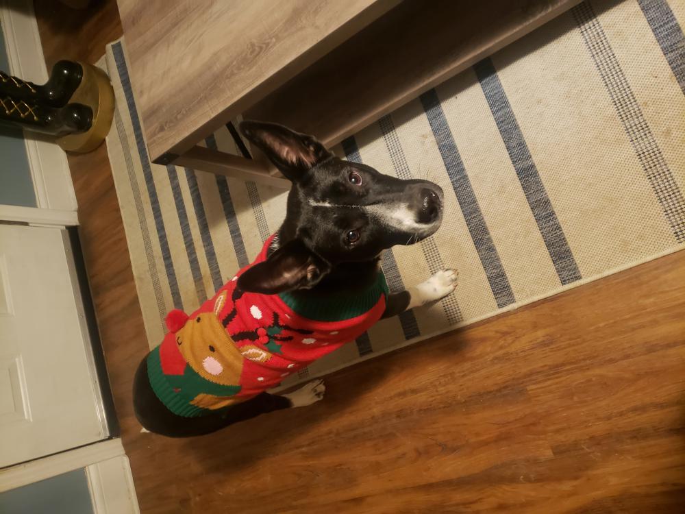 Pet Description:40ish pounds. Black with white belly and legs. Large ears that stand up. Purple collar. She is chipped. |