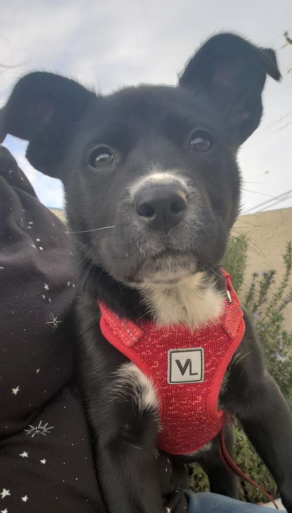 Pet Description:Puppy, about 18 pounds, black with white toes, nose & breast. |