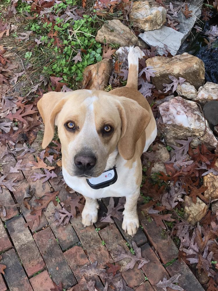 Pet Description:He is a blonde male short legged beagle with a possibly shock collar around neck |