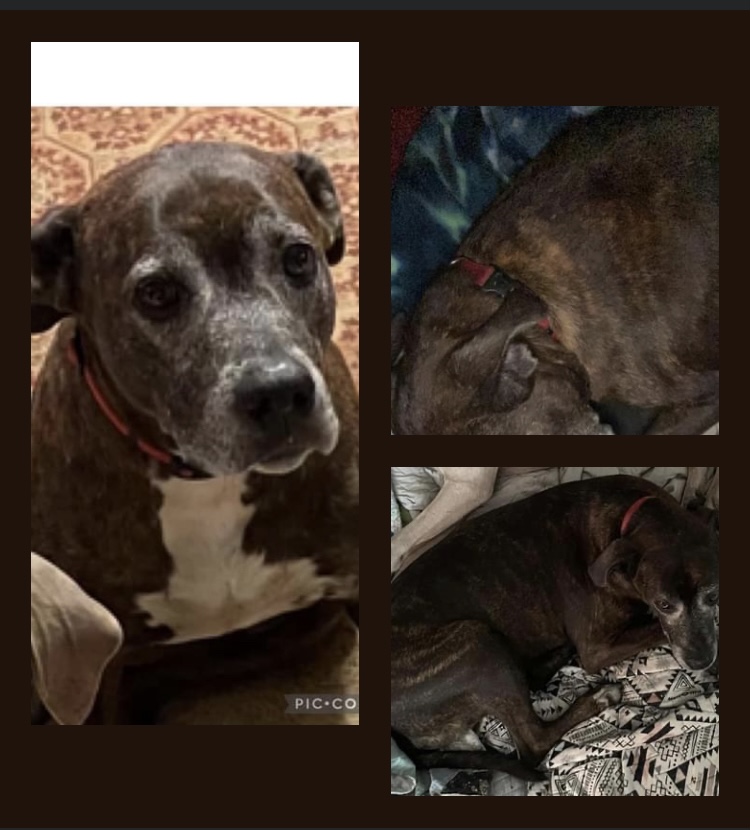 Pet Description:She’s an older reverse, brindle pitbull with going gray face and a red collar if it’s still on. She has a white chest.She is skittish so go slow reaching for her. |