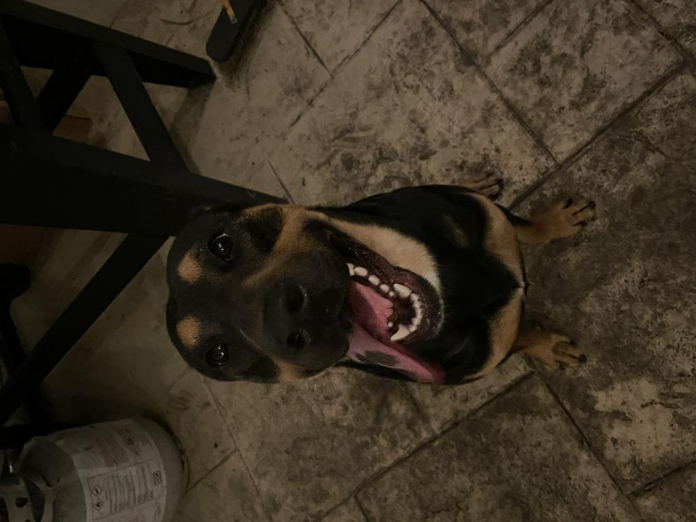 Pet Description:Rottweiler looking puppy mix, dark spots on tongue |