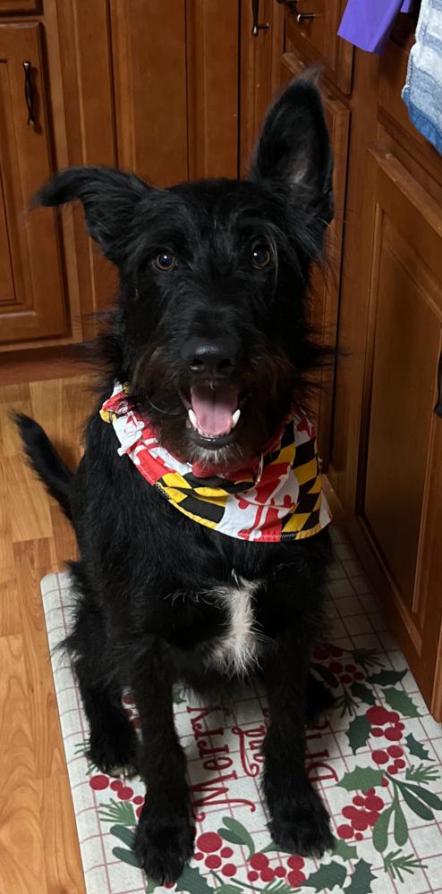 Pet Description:GSD and German Schnauzer He is tall and looks like a scotty dog with long legs. He has a black broken coat with a white blaze on his chest. He has pointy ears with the left upright and the right bent. He has a long tail the curls towards his back. |
