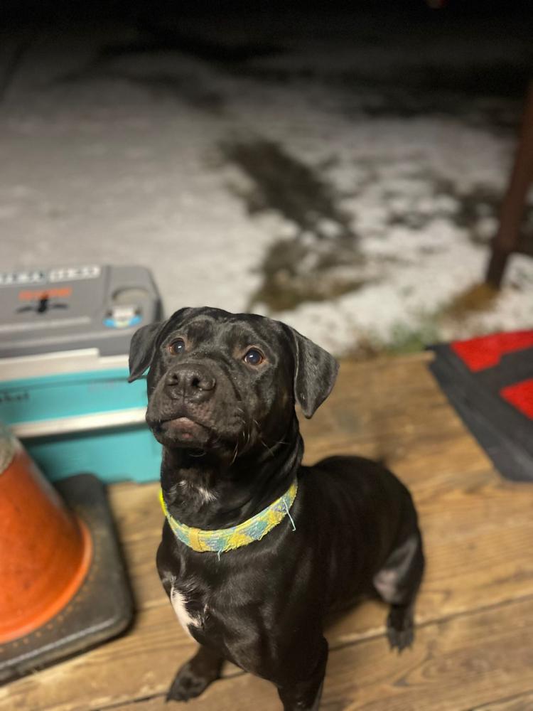 Pet Description:Pit bull / Lab Mix Roughly 80lbs Has a White marking on chest Blue & Green reflective collar on |